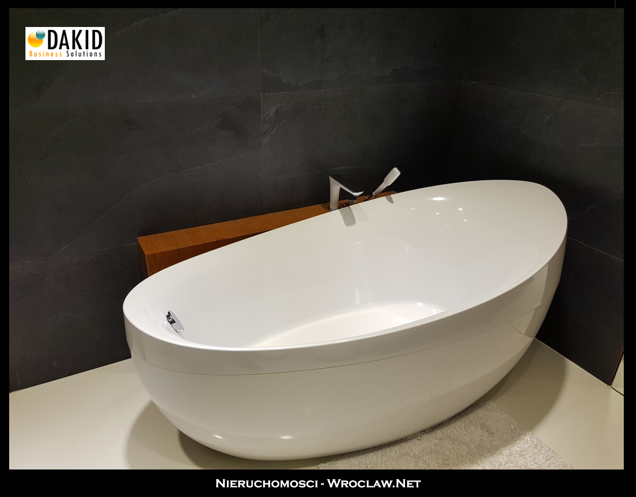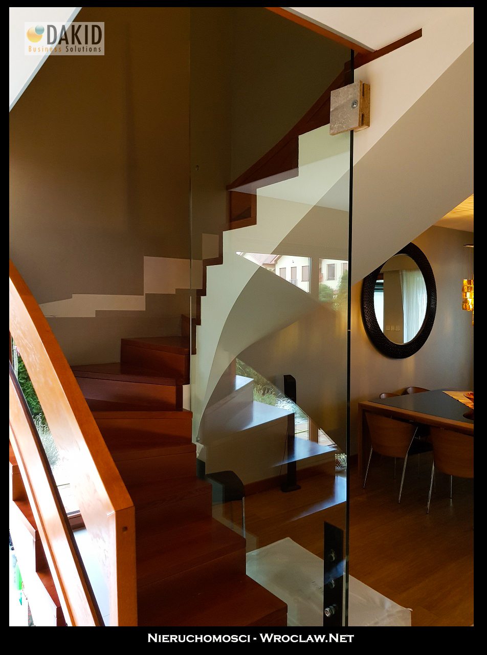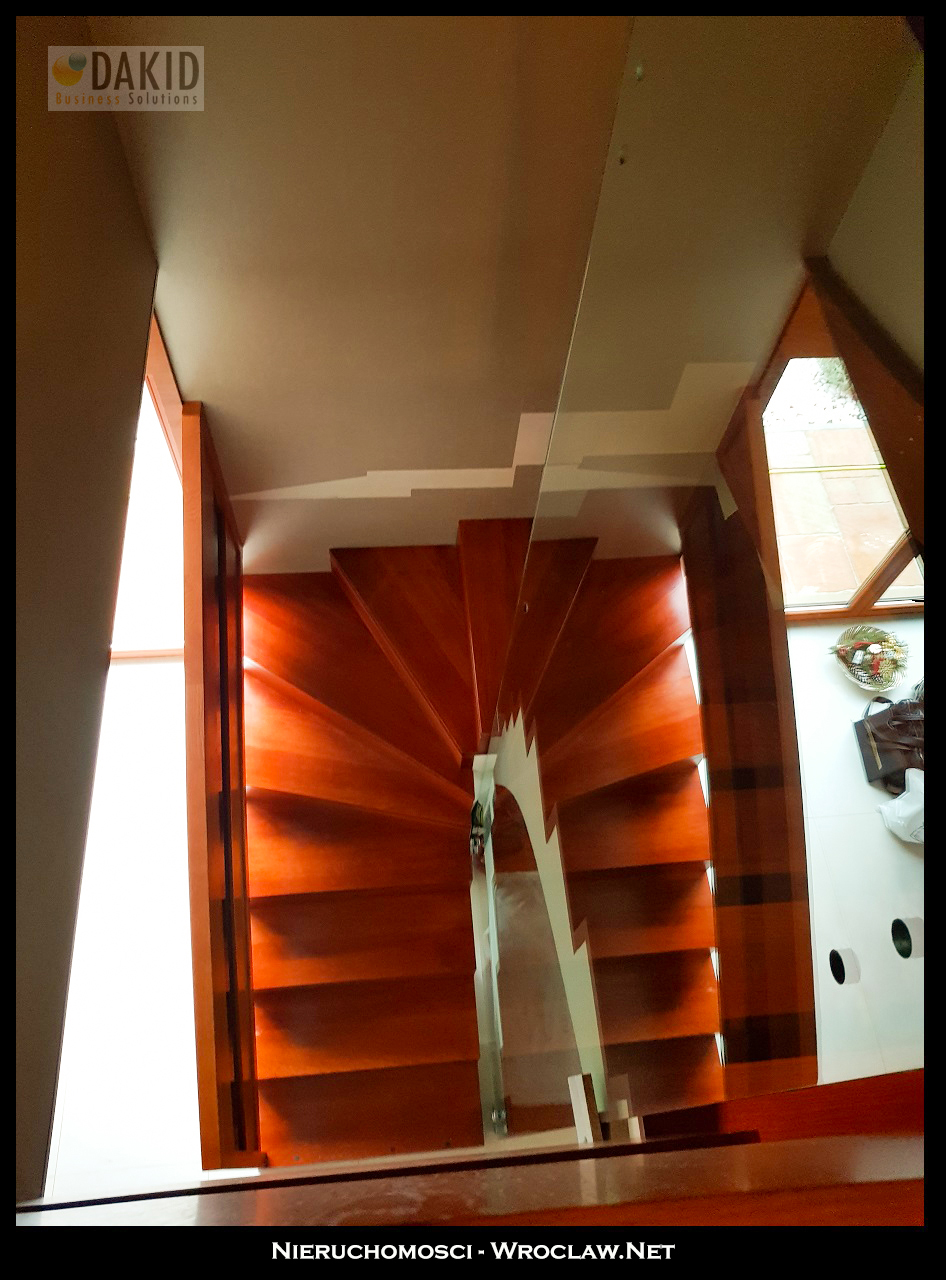 Schody wykonane z drewna egzotycznego. Na kolejnym poziomie trzy niezależne sypialnie. Łazienka i główna sypialnia połączone z garderobą (prowadzą do niej dwa niezależne wejścia). W łazience piękna wanna wolnostojąca oraz prysznic. Łazienka posiada wbudowany system wentylacji i klimatyzacji wnętrza. Pięknie prezentuje się w niej ceramiczna wanna wolnostojąca na podłodze z żywicy.