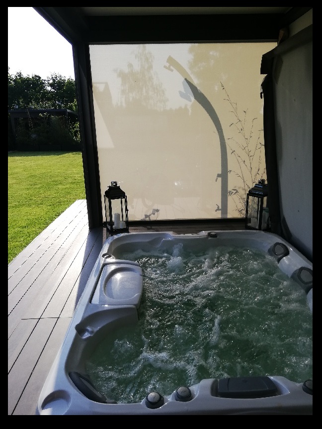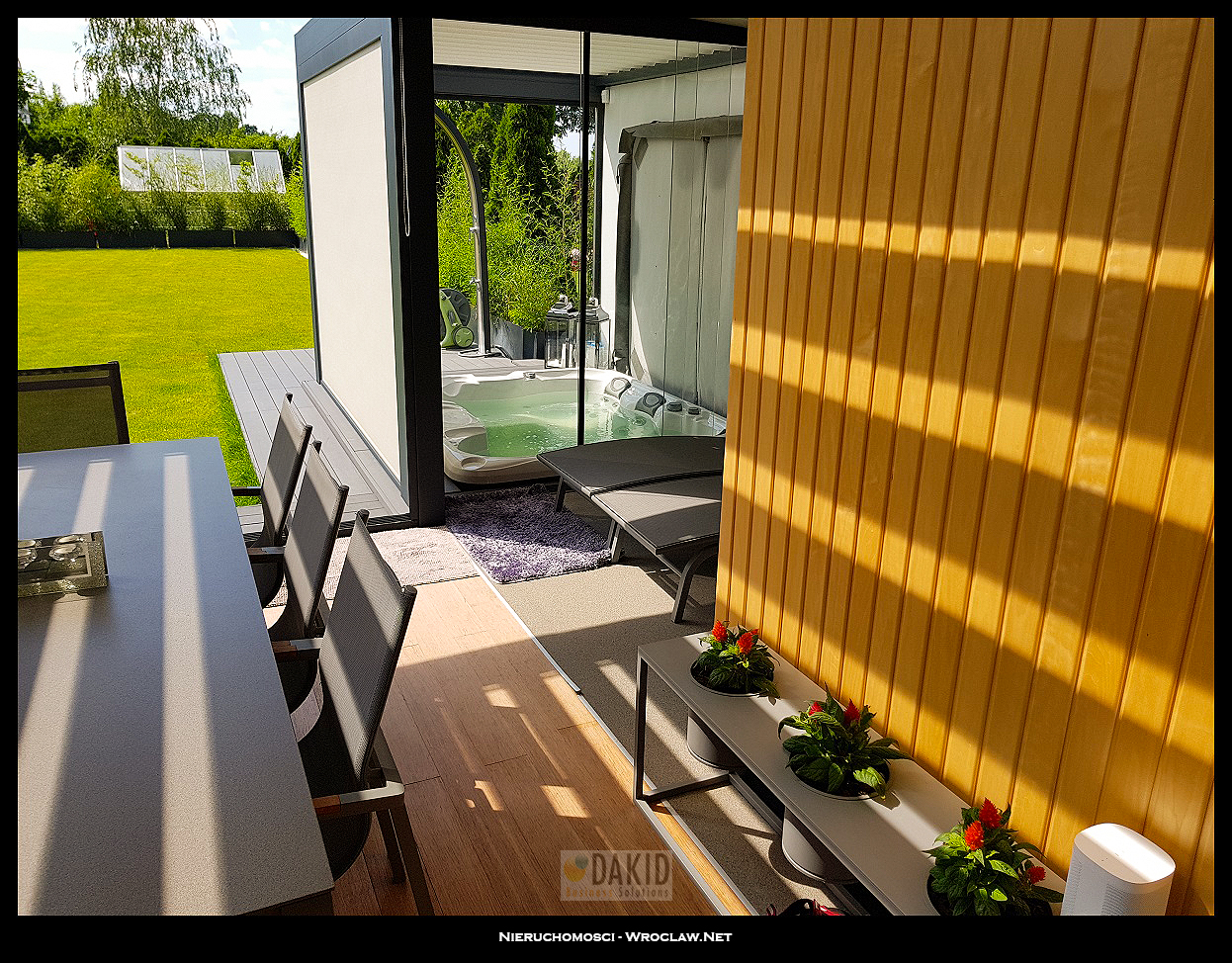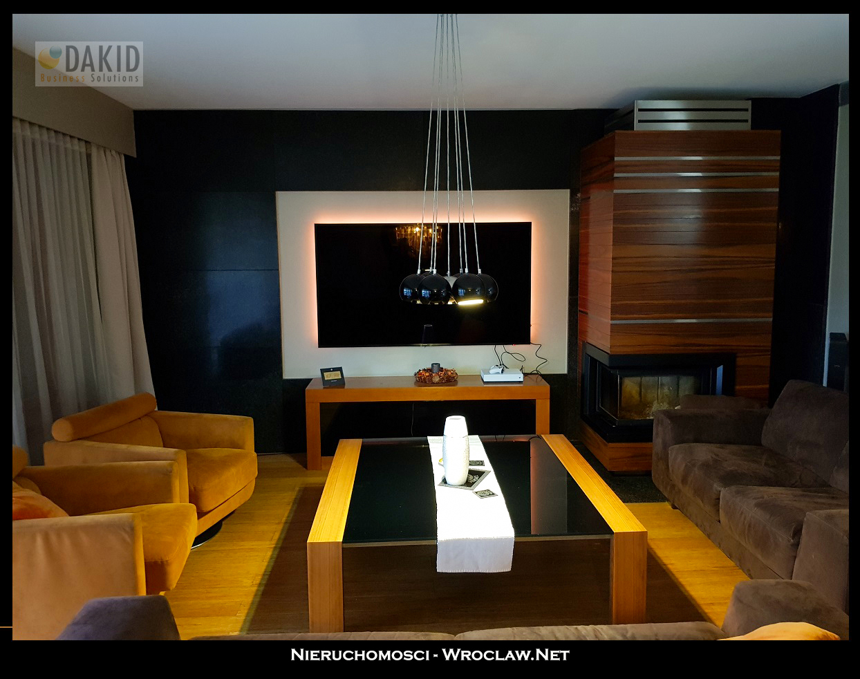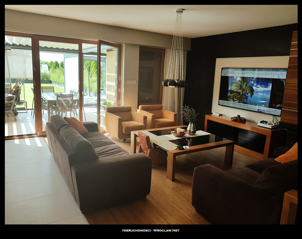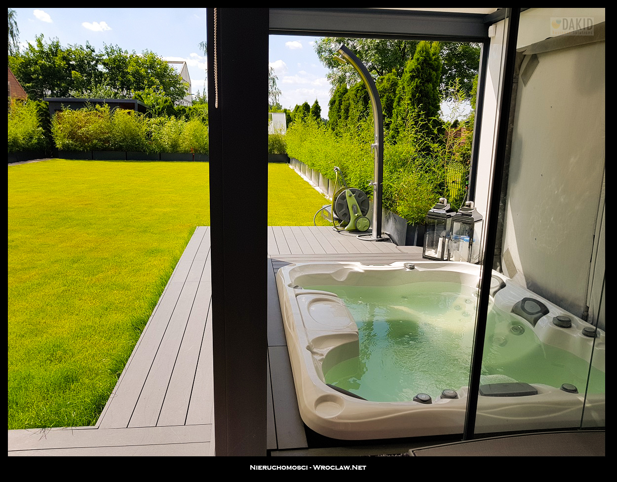 W salonie zamontowano kominek obudowany drewnem egzotyczny, podświetlenie leedowe, system sterowania zasłonami, lustro ozobne oraz specjalny żyrandol wykonany z masy perłowej. Salon połączony z tarasem z zabudowanym jacuzzi oraz sauną. Ustawny, zadbany i bardzo dobrze zaprojektowany ogród Działka duża i ustawna, ogród zadbany z własnymi podświetleniem.
