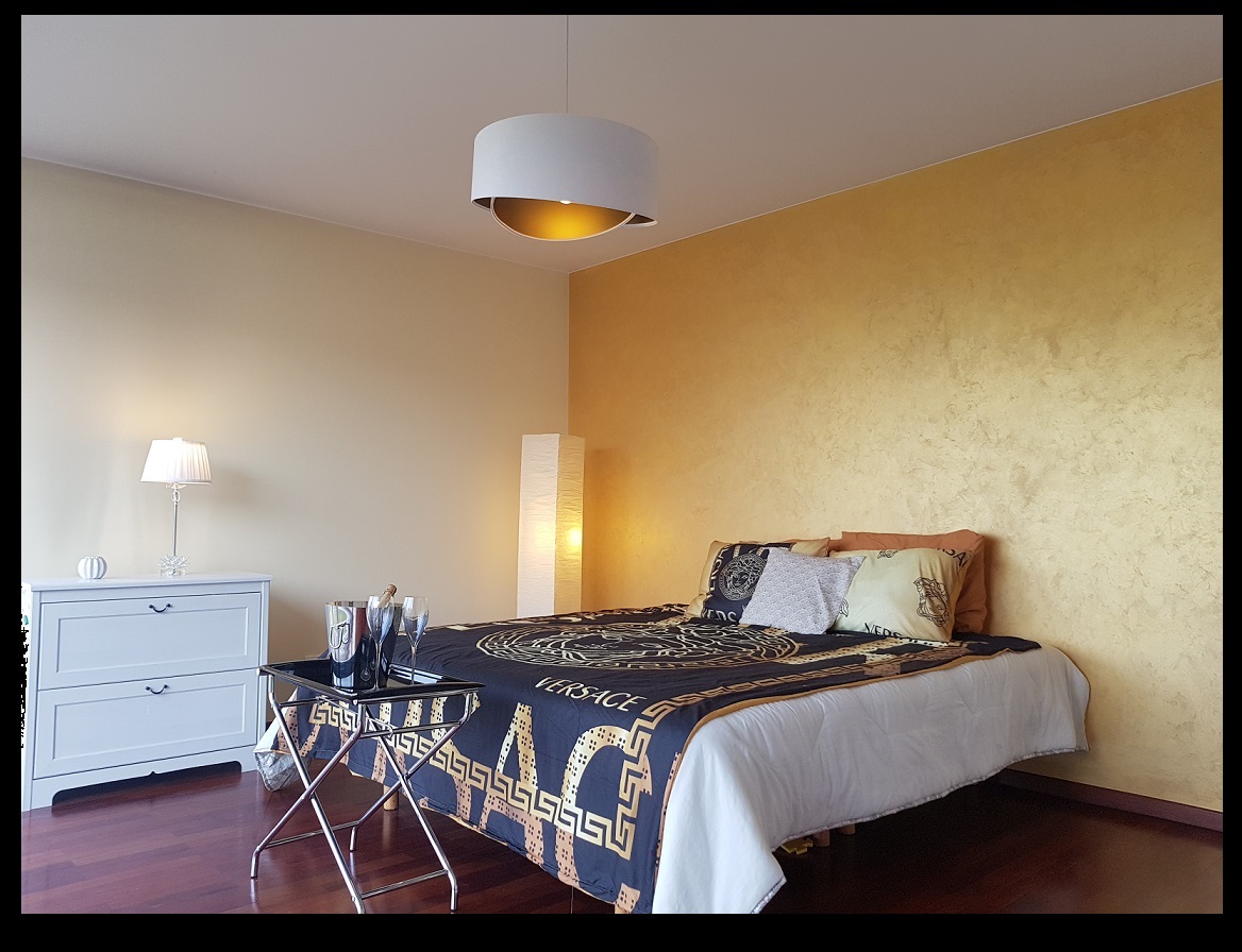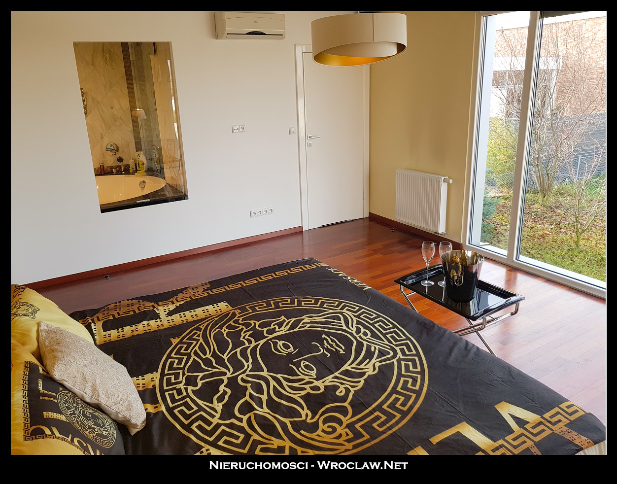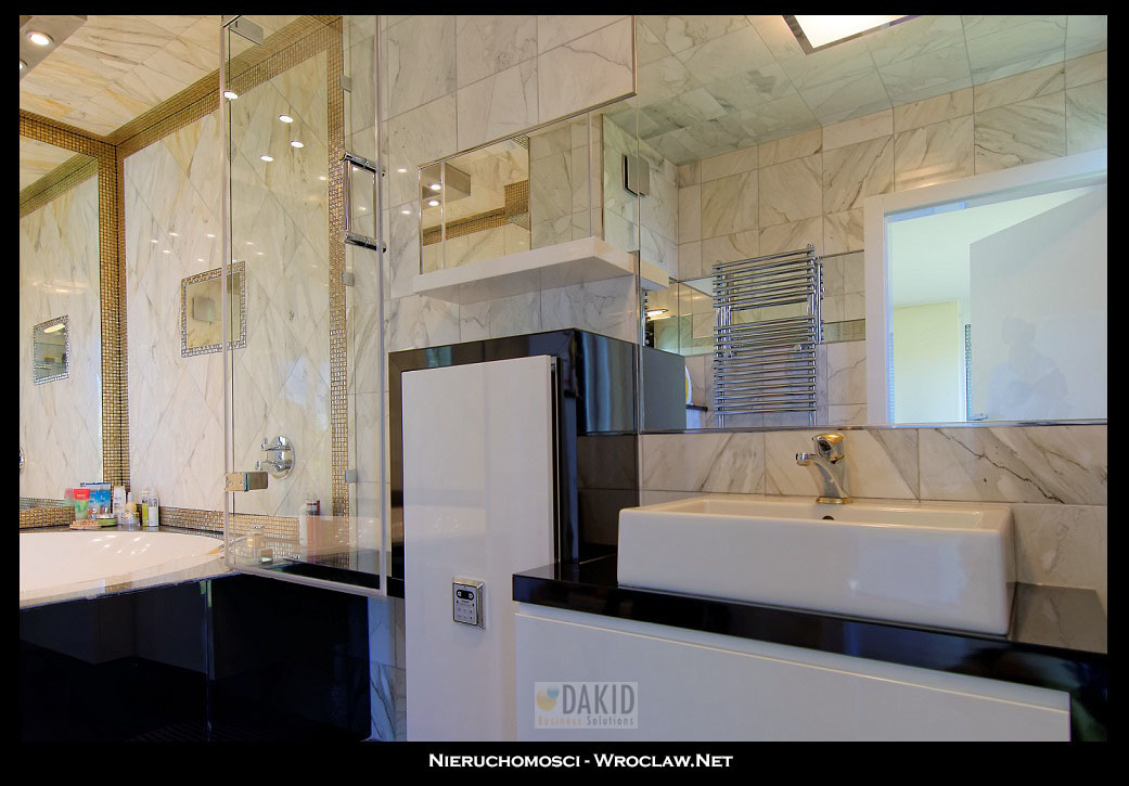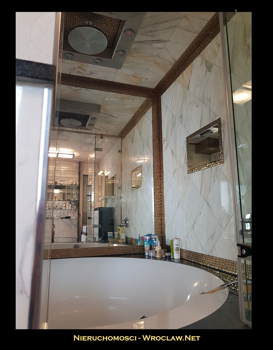 Główna sypialnia (20m2) połączona z dużą ustawną łazienką (ok 7m), wyłożona kamieniem (granit + marmur) z wanną narożnikową o średnicy ok 2m z zamontowaną deszczownicą i funkcją łaźni parowej (Hoesch), podkreślona wbudowaną złotą mozaiką. Duża połać lustra powiększa optycznie wnętrze.