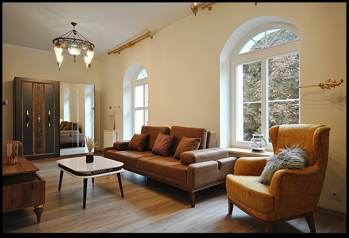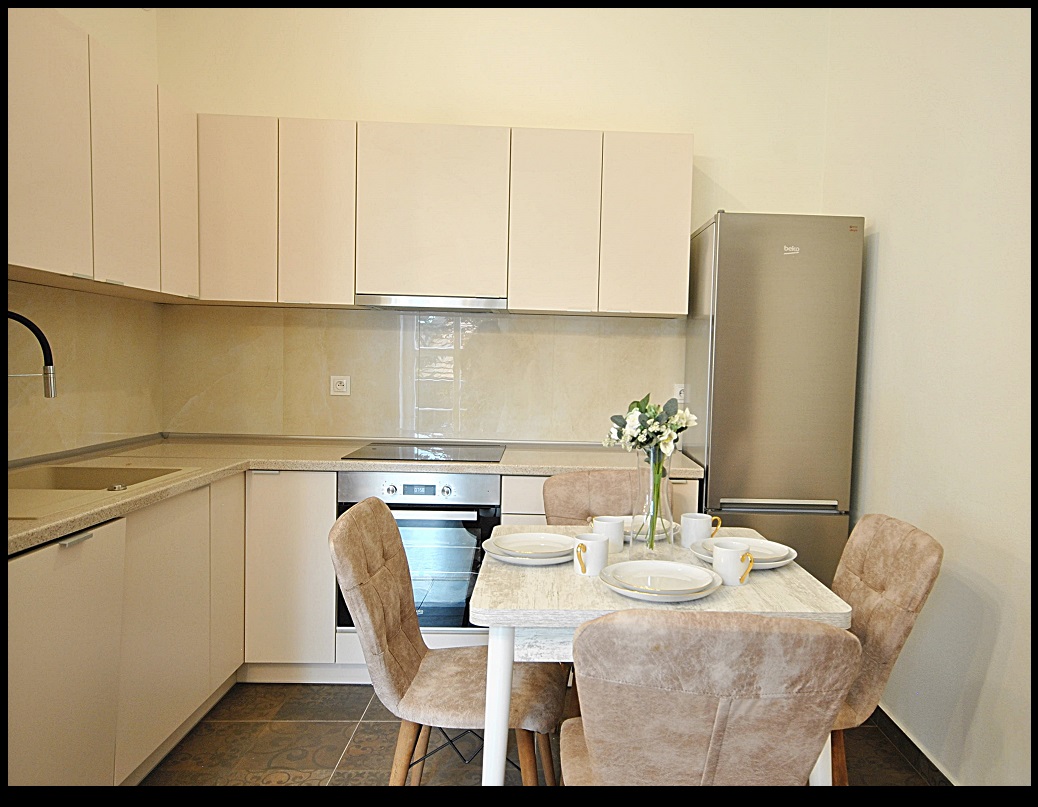 Podłogi: panele + markowe kafle. Centralne ogrzewanie + podogowe. Ściany: farba. Markowe meble, łóżka (producenci zagraniczni) oraz bardzo dobrze dobrane oświetlenie. Kuchnia zaprojektowana pod wymiar, w pełni wyposażona. Łazienka nowa, wykończona bardzo dobrej jakości materiałami ceramicznymi.