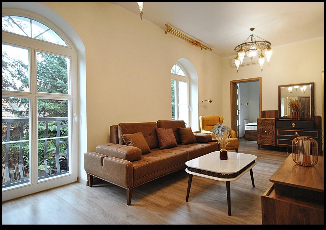 Standard of furnishment: floor panels + tiles. Central and floor heating. Walls: paints. Unique furitures and equipment. Very nice lightening. New bathroom with high quality ceramic materials. Installed floor heating and air conditioning